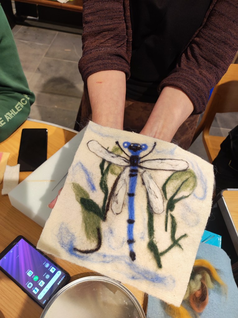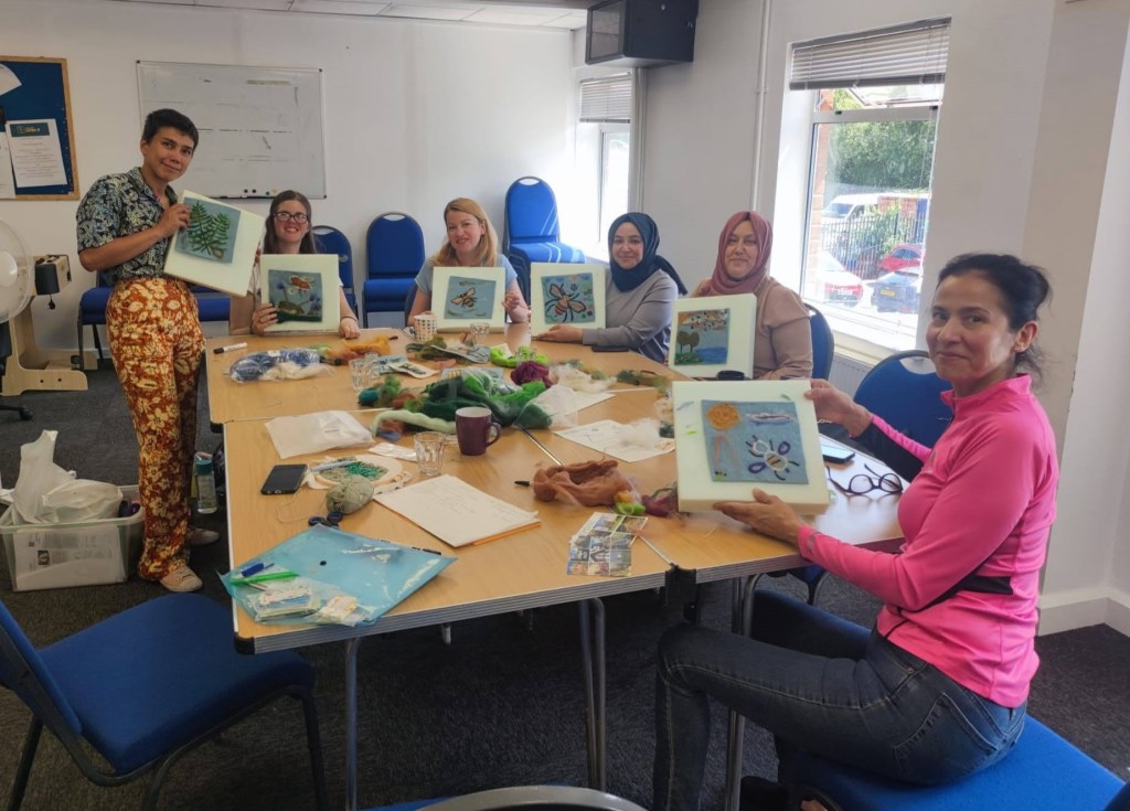 Creative sessions are taking place in Glastonbury, Bridgwater, Taunton and Yeovil, and so far the groups have learnt new skills with needlefelt, punch needle, applique and stitch. English is not their first language, but this has not prevented them from learning about and celebrating natural yarns and traditional textile crafts, creating beautiful images of damselflies, dormice, shrill carder bees, ferns and bluebells, that will help to highlight the impact of habitation loss on the fauna and flora within Somerset.